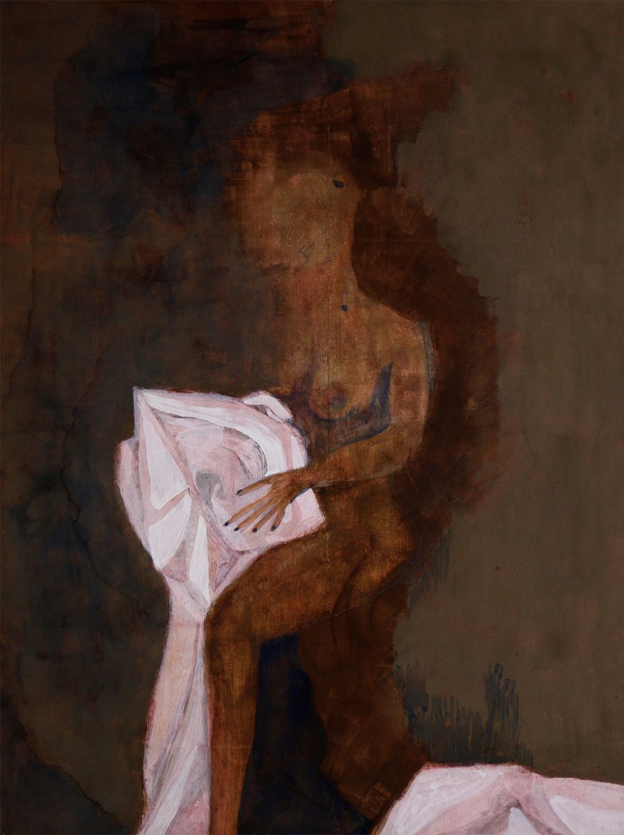 This painting blends a powerful yet delicate aesthetic, expressed through the fusion of figure and texture. The minimalist depiction of the human form, with flowing contours and restrained color tones, creates space for interpretation and emotion. The earthy color palette contrasts with the soft whites of the cloth held in the figure’s hands — a symbol that may evoke protection, transformation, or vulnerability.