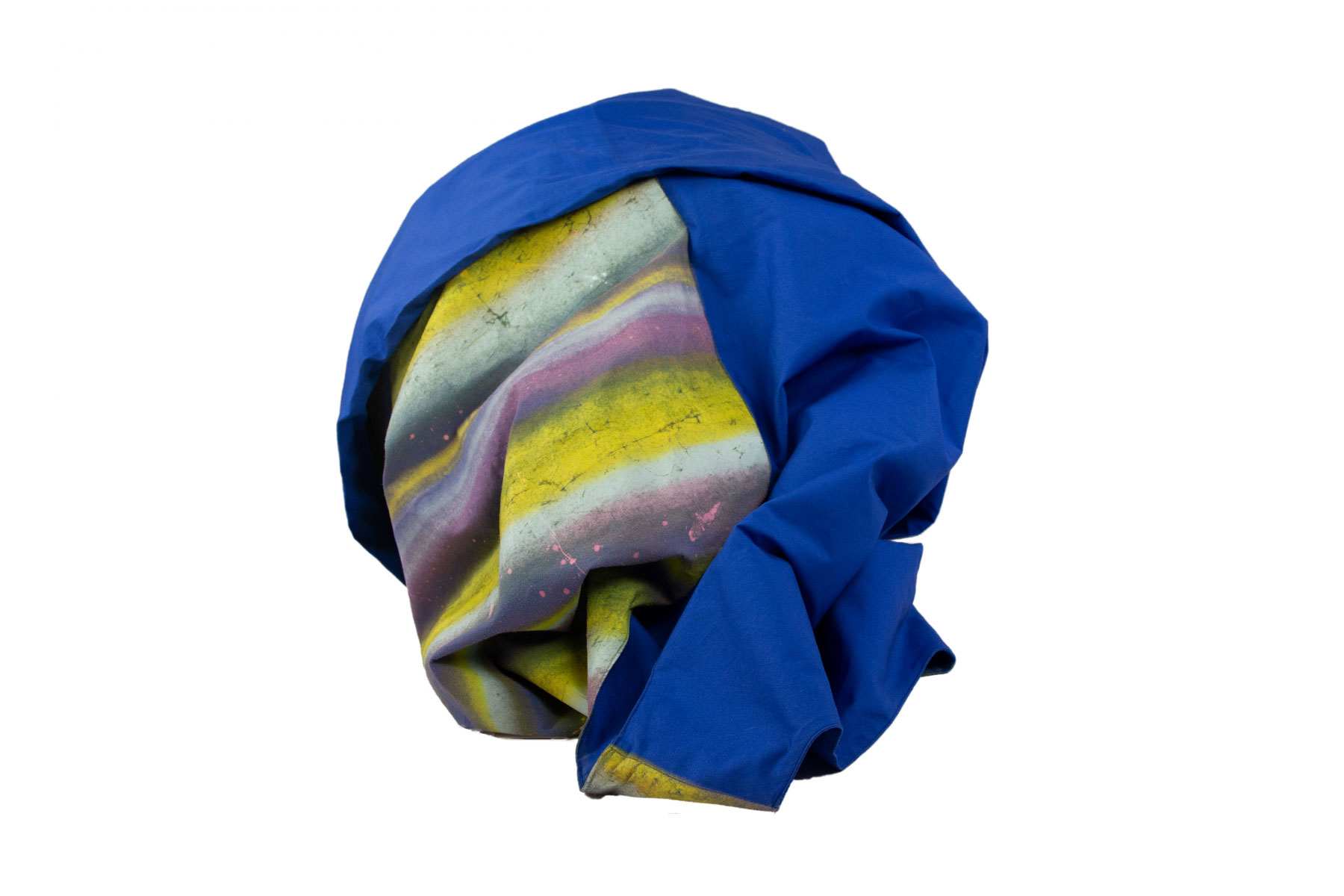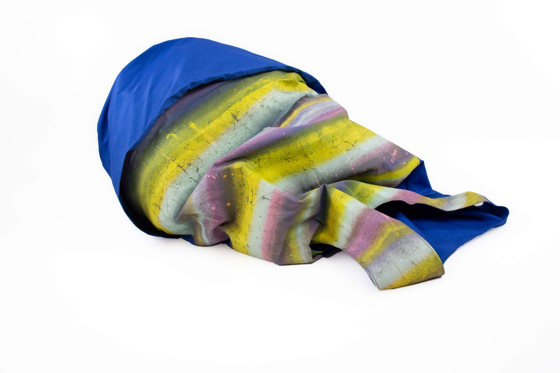 The artwork depicted is a dress that can be interpreted as both a painting and a sculpture. It combines textile art with expressive painterly elements. The fabric of the dress is draped and features abstract color gradients in yellow, pink, purple, and blue, resembling brushstrokes that create a vivid and dynamic effect. At the same time, the folds and the three-dimensional presentation emphasize the sculptural quality of the piece.