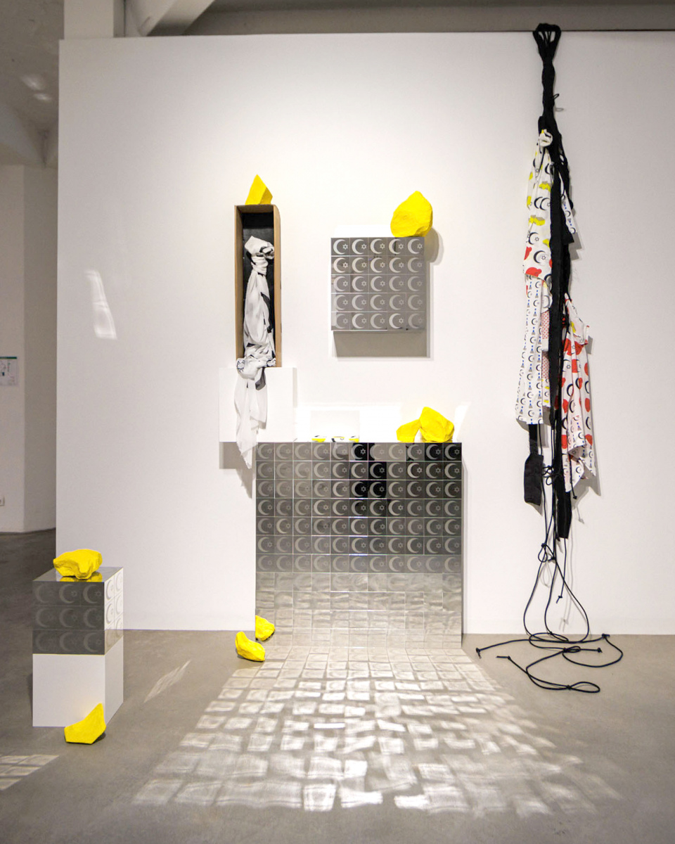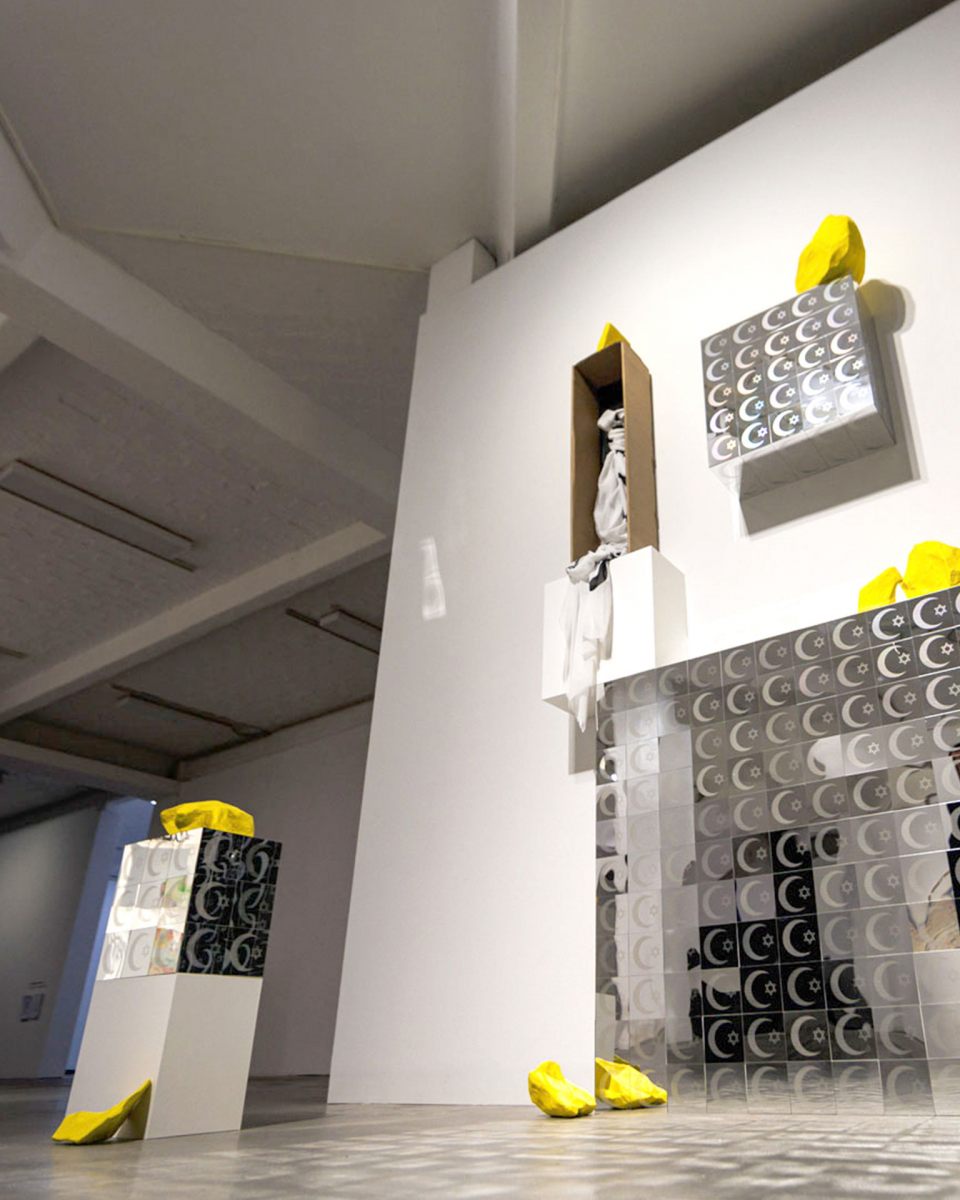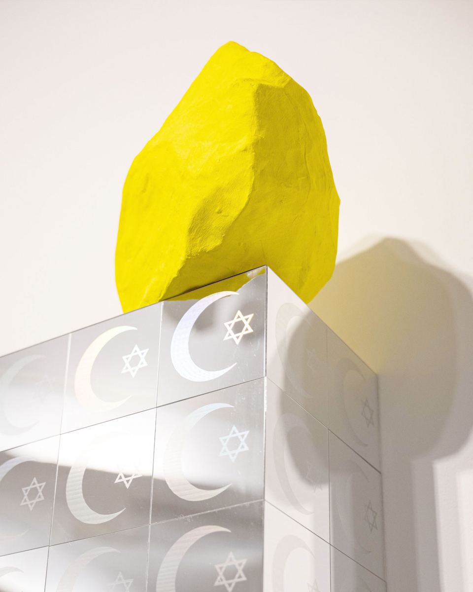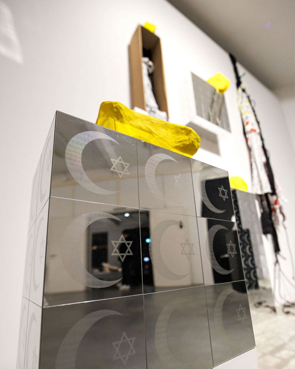 Ali Gharib connects the traditions of Islamic and Jewish prayer garments to symbolize unity and dialogue between the two faiths. Interlocking elements of the Star of David and the crescent moon form the central motif, processed ornamentally to represent the visual language of both religions. Employing contemporary pop aesthetics, the artist embeds his work within a consumer-oriented context while engaging with modern visual themes. Critically, Gharib draws on Theodor W. Adorno’s Aesthetic Theory, viewing art as an opportunity for reflection and questioning the shadows of civilization. Gharib brings Seyyed Hossein Nasr into this conversation — a thinker who emphasizes enlightenment through the metaphysical commonalities of Islam and Judaism — inviting viewers to reflect on shared values and traditions.