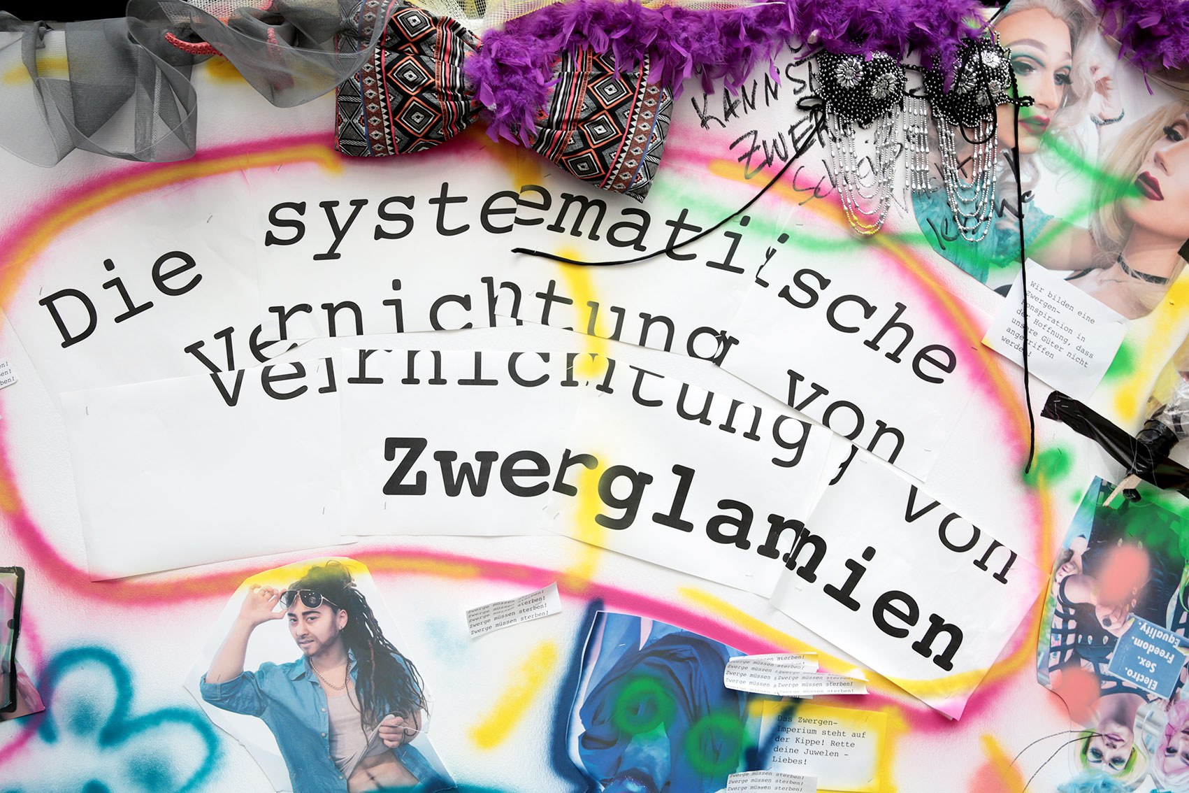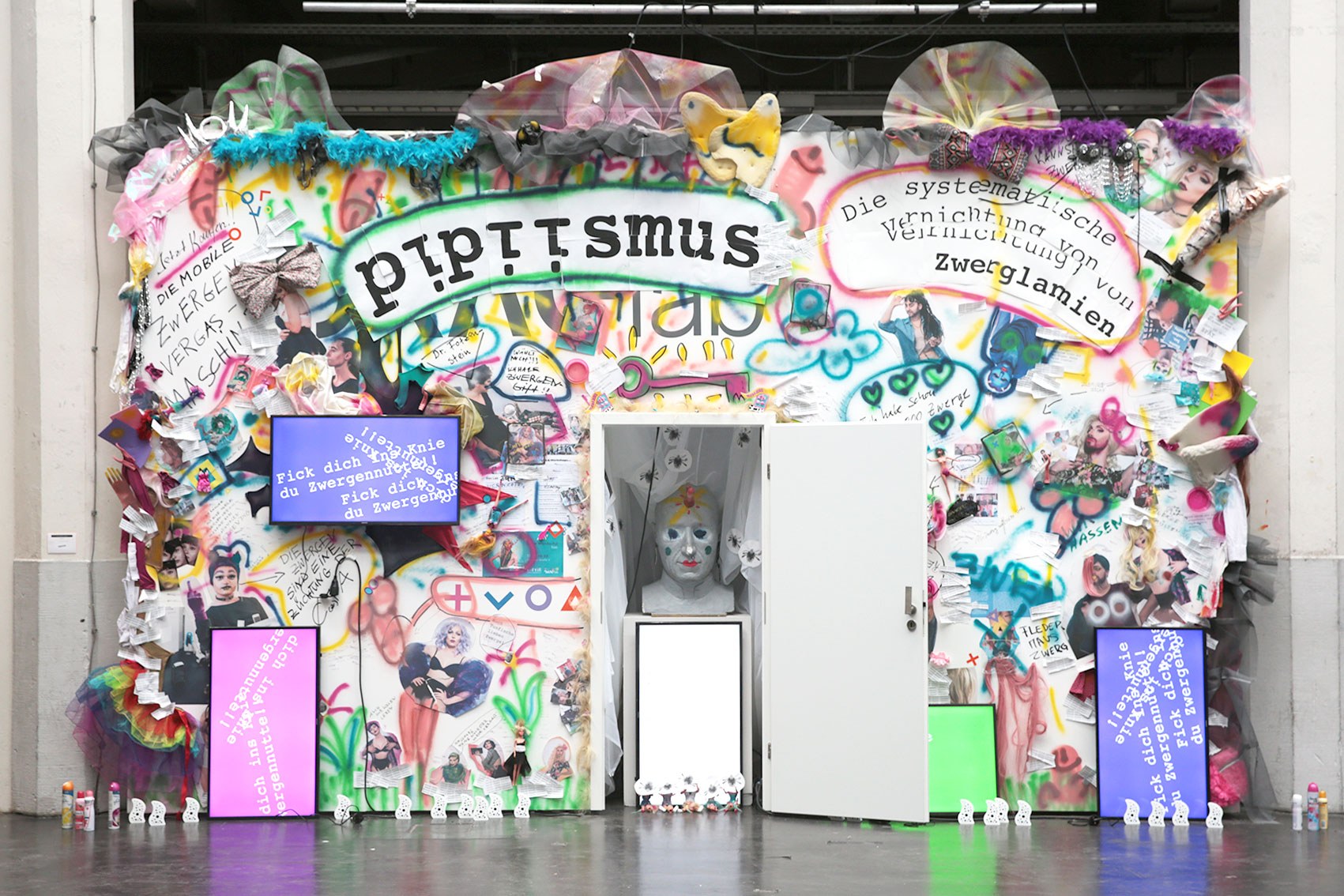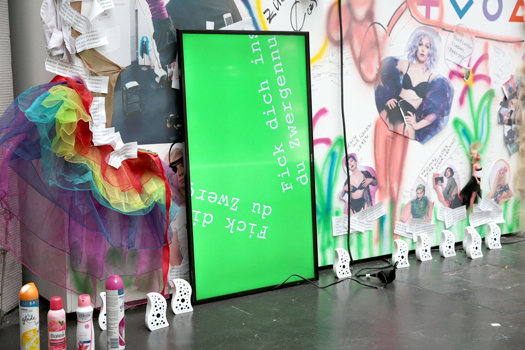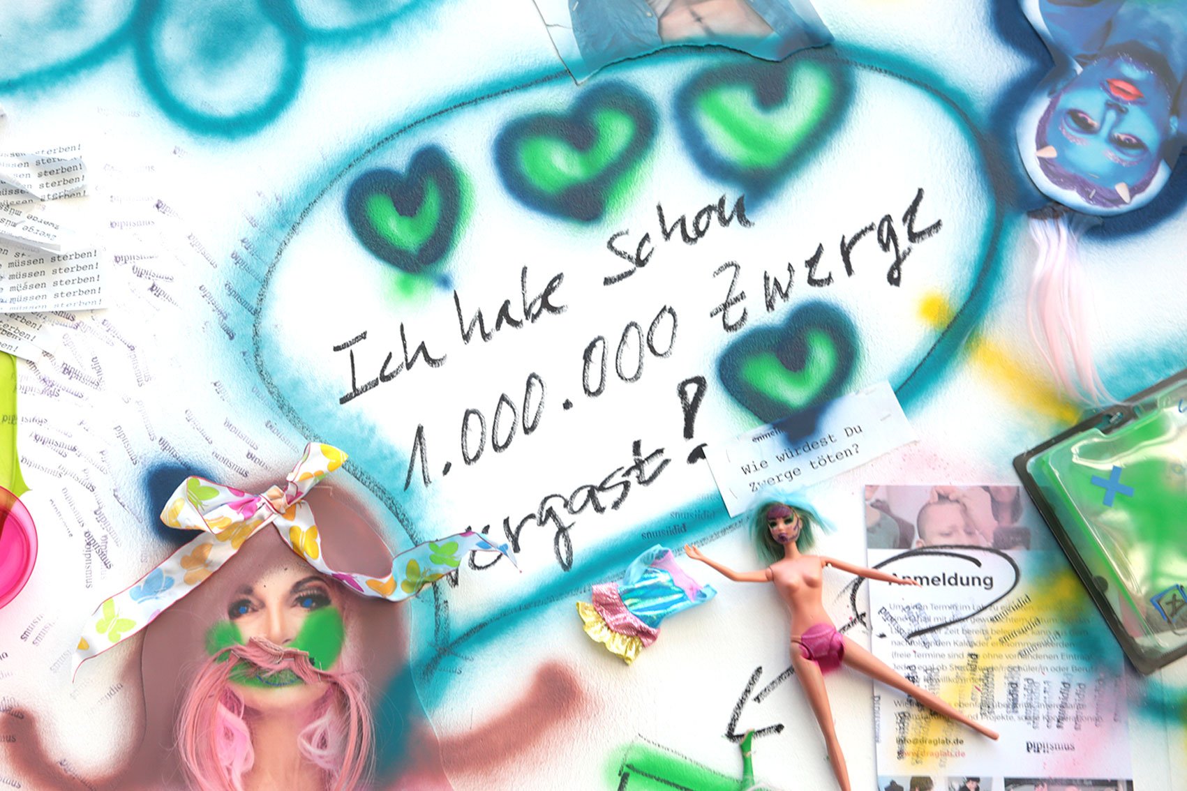 The installation Die systematische Vernichtung von Zwerglanien (The Systematic Extermination of Zwerglanien) employs elements of exaggeration and visual overload to address social, cultural, and potentially political dynamics. By using diverse media — including graffiti elements, images, videos, texts, and everyday objects such as dolls or spray cans — the artist creates a space that is both physically and symbolically charged.