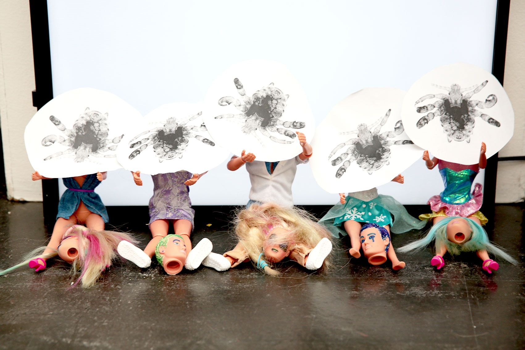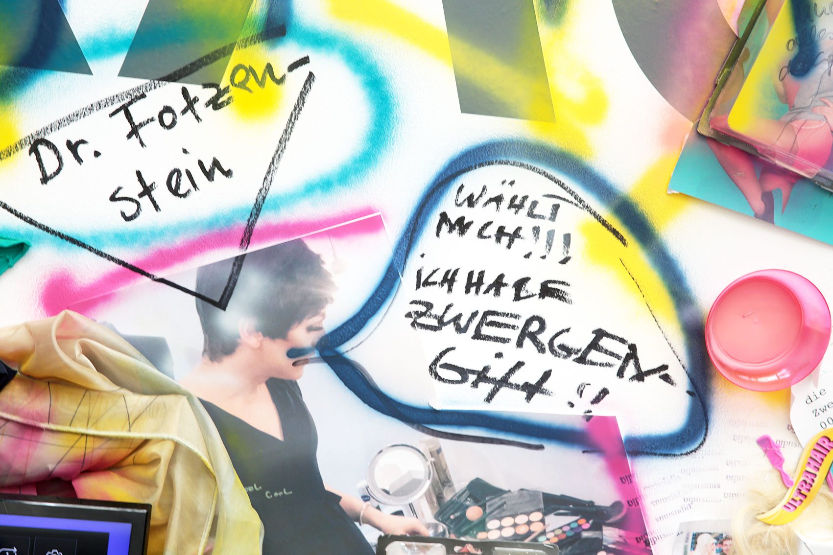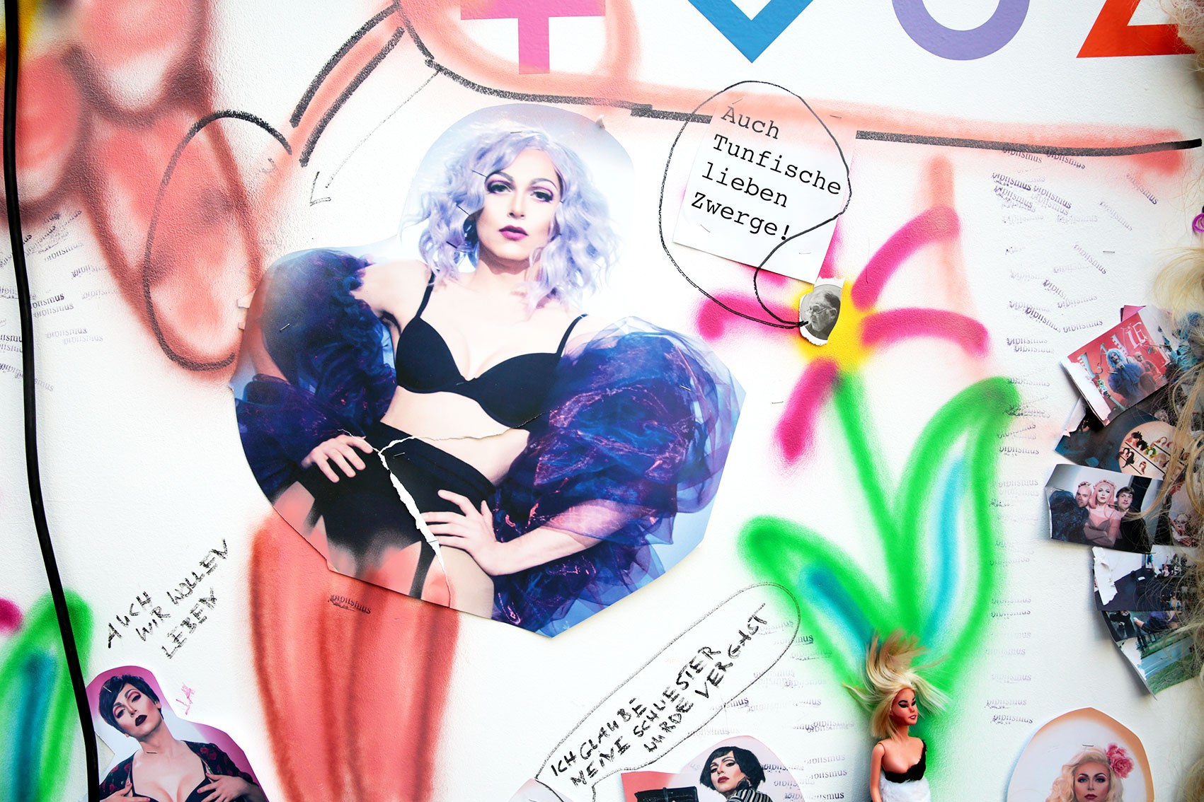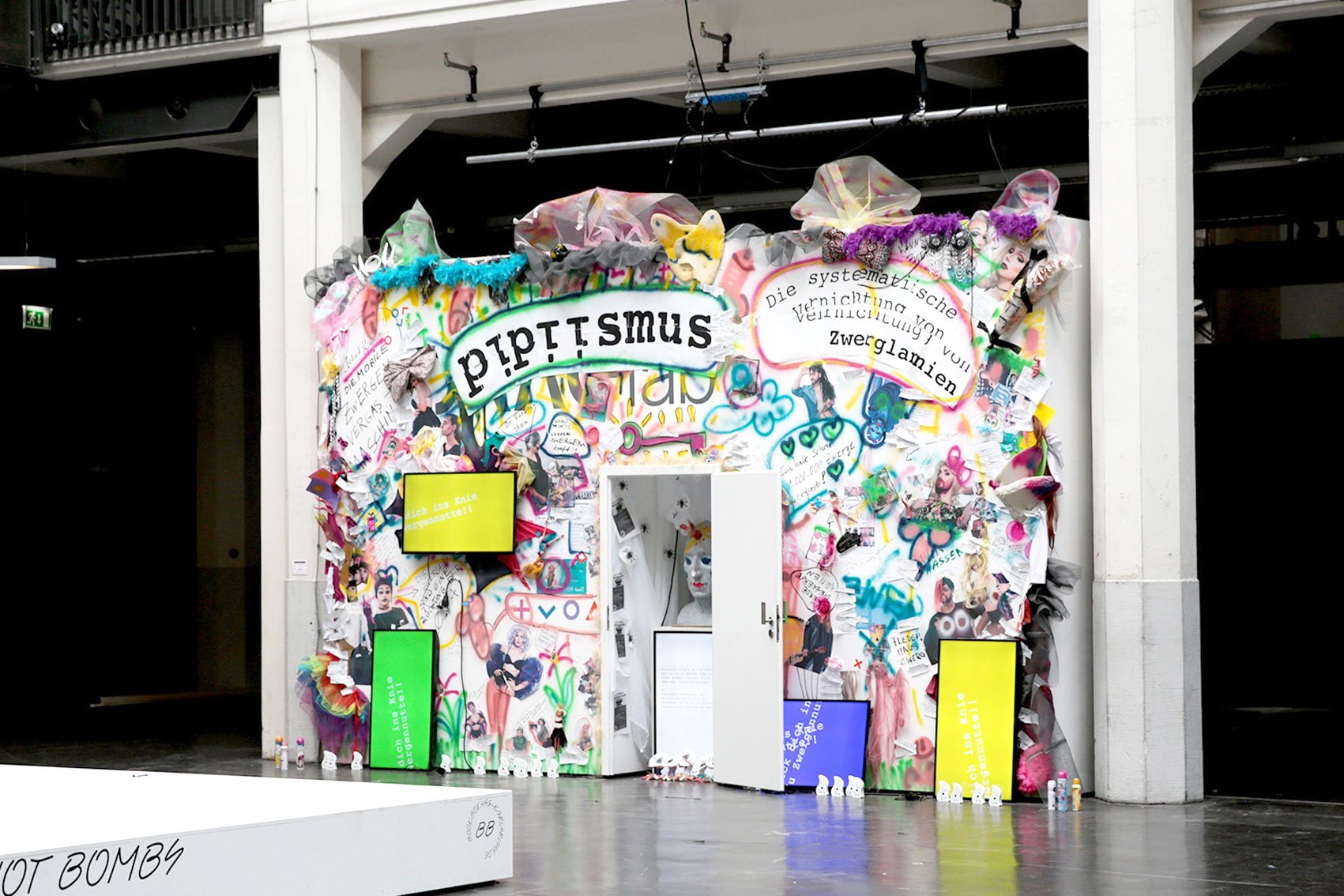 The installation Die systematische Vernichtung von Zwerglanien (The Systematic Extermination of Zwerglanien) employs elements of exaggeration and visual overload to address social, cultural, and potentially political dynamics. By using diverse media — including graffiti elements, images, videos, texts, and everyday objects such as dolls or spray cans — the artist creates a space that is both physically and symbolically charged.